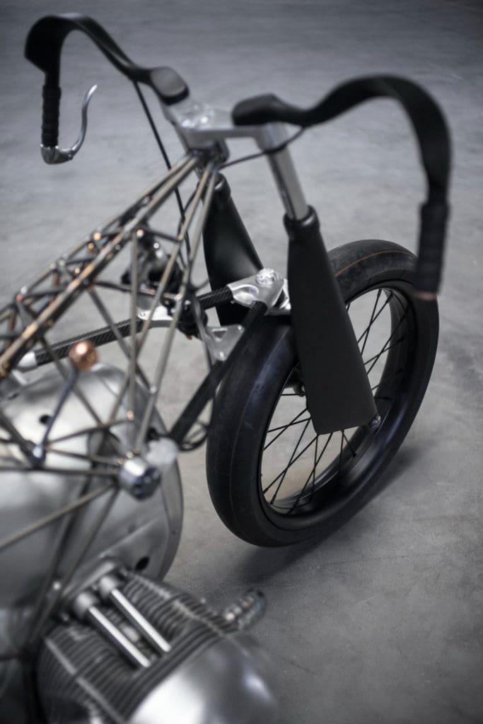 We spoke about this at xmas time – when BMW first showed off its new 1800cc flat-twin Boxer engine in a Japanese custom machine. And here’s another chance to see the big new lump, which was shown at the Handbuilt custom bike show in Austin, Texas last week. Built by US firm Revival Cycles, it’s quite a sight, though we’re not sure how practical it would be. Dubbed the ‘Revival Birdcage’, it uses a radical fabrication technique for the chassis – small-diameter titanium rods, hand-welded into a massively triangulated, super-stiff space frame. It’s a work of art rather than a piece of practical engineering of course – we can only imagine the hours that went into all those fiddly TiG welds.