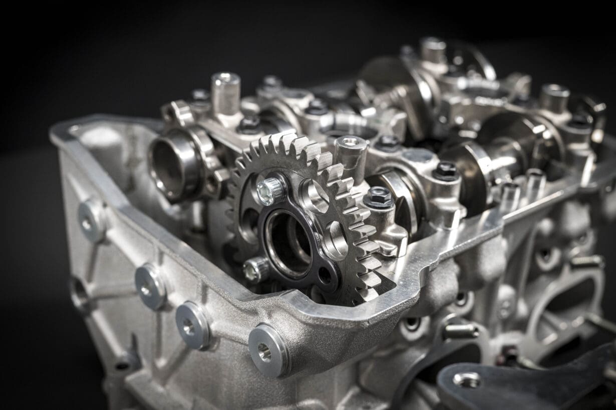 But a huge battle for a racing engine is Euro5+ regulation. This engine needs to be compliant, so how have Ducati managed to achieve that same performance with those restrictions? Well, they’ve actually found more performance, which is some mind-boggling magic right there. For a start, they’ve completely re-designed the inlet manifold to allow a different position and angle of the port-fuel injectors. They now feature on the opposite side of the engine than before and by doing so has changed the length of the injector spray into the combustion chamber. Therefore, the throttle body design has also been changed with the throttle butterflies now rotating counterclockwise due to the new position of the injectors. These changes enable the air flow to mix more efficiently with the fuel spray pattern, producing a potent air-fuel mixture. Furthermore, shortened variable intake trumpets also feature on this engine, gaining valuable mid-range torque. Ducati have also changed the exhaust cam profile, which now allows the exhaust valve to open a little later. The aim of this new design being to improve the efficiency of the combustion, which helps both to increase torque and reduce emissions. The exhaust system has been completely redesigned and these new features help Ducati to comply with Euro5+. Despite the emission rules constantly being thrown at manufacturers, Ducati have come out laughing as they’ve found more torque whilst still playing the game. With these re-designed aspects, they’ve managed to increase the torque in a wide range of engine speed, whilst still achieving the same peak power as the previous version, but now being Euro5+ compliant. To give some specifics, this engine is up +4hp at 16,000 rpm, has 7% more torque at 6,000 rpm and has an increase of 3% of peak torque. This gives an average of 4hp more between 8,000 – 16,000rpm and ultimately greater regularity at low revs and during acceleration above 7,000 rpm, delivering stronger torque and power curves over the entire working range and better over-rev capabilities than the 2023 Desmosedici Stradale engine. What does this mean? Essentially this will give the rider more pull from the engine in the most usable range of speed on track and gives that incredible feeling of drive when you twist your wrist. There’s even more to be had too if you decide to utilise the Akrapovič performance racing exhaust system, saving 6.6kg in weight, and use the ‘Ducati Genuine Oil Powered by Shell Advance’ which results in even stronger torque and power curves over 9,000 rpm, peak power is up + 17.3hp @15,750rpm and peak torque is up + 5Nm @ 12,000rpm.