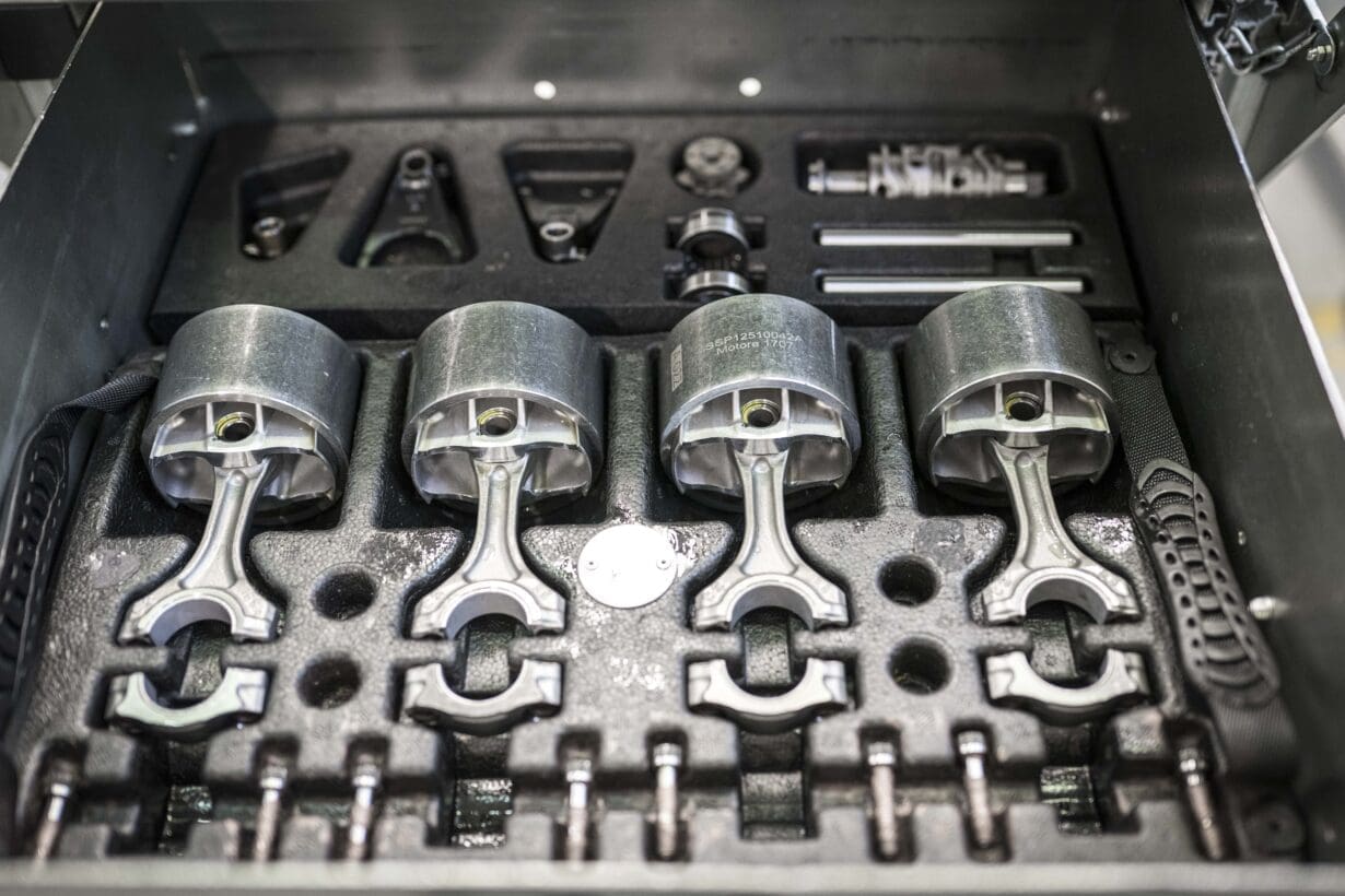The 2026 Desmosedici Stradale still retains its 998cc displacement so it’s compliant to World Superbike regulations and it also keeps the twin-pulse firing order like the previous V4 R iteration. Aside from performance reasons, the twin-pulse touch feels like a subtle nod to their superbikes of the past that used a V2 configuration as it gives the engine some behaviour characteristics that are more V-twin-like, such as the sporty sound as well as a nice, linear torque curve. The “rough, raw, ‘typical Ducati’ sound” is something the R&D department say they really didn’t want to lose when moving from the V2 to the V4 and the twin-pulse firing order helps get close to that melody. As well as this, it’s among the firing orders that produce less secondary vibrations so it doesn’t require any kind of balancer shaft and also lowers the load and friction on the valvetrain, which therefore enables higher rpm. All good stuff. We also saw on the previous Desmosedici Stradale R engine that a lot of work had gone into improving the pistons which boasted a skirt finished in DLC (Diamond Like Carbon); a surface treatment used in MotoGP and also F1 racing, which essentially reduces the friction between the piston and the liner. On the 2023 V4 R, we saw this being applied for the first time to a road engine and it’s made a return for the 2026 version of their power house’s pistons. I was able to hold some example pistons from the Ducati production line and the DLC coating really is beautiful; silky to touch in a deep graphite colour and a luxurious finish as gleaming as lip gloss. But what is new about the pistons is that they’re even lighter, by 5.1% to be exact. The pistons are something that Ducati worked a lot on because, one of the main sources of friction inside the engine comes from the pistons and by lowering the weight also lowers the friction. To compliment this further, the MotoGP derived titanium conrods have also returned, again with the additional ‘gun drilled’ design, typical of a racing engine, and a ‘shot peened’ surface treatment which reduces the wear of the conrod.