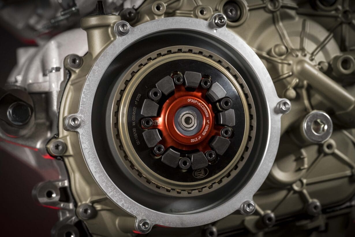 The cylinder head alone has exactly the same position for the camshaft, valves and ports that would be found in the current Desmosedici GP15 engine, albeit the GP engine can use more exotic materials and manufacturing processes. Other developments that have been directly transferred straight from MotoGP to this new engine include the same 81mm bore, a Twin Pulse firing order, that high-revving Desmo valvetrain, the fact the engine is in a backwards-rotated position and it now flaunts a counter-rotating crankshaft. The V4 R is also equipped with the compact dry clutch derived from the version used in their World Superbike by the official Ducati team. Compared to the clutch fitted on other V4 models, the diameter and axial length have been reduced by -24mm and the weight has been reduced by approximately 800g. My list of excuses for not setting a fast lap time are quickly reducing already. That book is soon to be thrown out the window anyway as the refinements made to the new V4 R keep coming at me, highlighting that this is a truly special piece of engineering. One of the reasons that makes this engine extraordinary is to do with that new counter-rotating crankshaft; a feature that is standard in MotoGP these days, but the new Desmosedici Stradale V4 R engine now showcases this making it the only production V4 with a counter-rotating crankshaft. Ducati are not shy in saying that this is an extremely complex solution for a production engine, however they were truly embracing the complexity as part of their ‘sophistication’ value. The biggest advantage is related to the inertial effects; every time you hard accelerate, the rear wheel has an inertial moment that wants to wheelie the bike and on the other side, when strong brakes are applied, the rear wheel decelerates and gives a force that wants to make the bike ‘stoppie’. Great for stunts but not fast laps. So, when the rotation of the crankshaft is the same direction as the wheels, it amplifies these effects but by having the crankshaft counter-rotating, it helps to reduce those stunt performances and enhance the stability of the bike. They assure me that the handling benefits are tangible because of the counter-rotation and that basically, it partially offsets the gyroscopic inertia of the wheels, ultimately enhancing the bike’s agility and manoeuvrability.