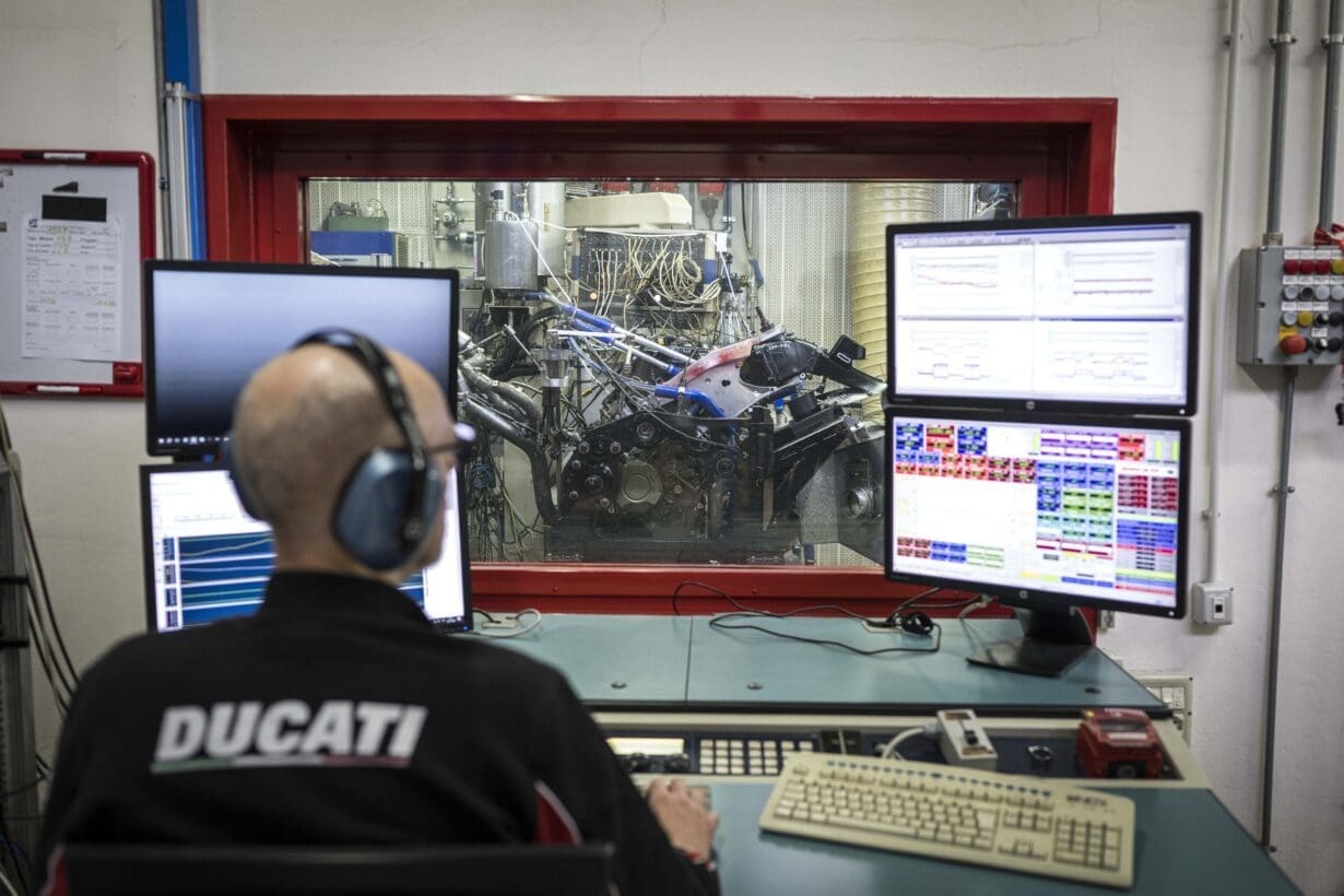 After years of being spell-bound as a kid and captured by the fascination of multiple machines lapping colourful circles on my television screen during a World Superbike race; to get the chance to visit Ducati HQ to see next year’s race engines in the flesh made me feel like Charlie at the chocolate factory. After being greeted with a friendly ‘Ciao, Grace’ and a generous slice of pizza in the factory canteen, this was shortly followed by a firm ‘nessuna foto’ – Italian for ‘no photos’ – as we were about to enter the engine testing department where engines for future production are developed; everything from their Desmo 250 MX engine to their 2026 MotoGP power-plant. I was even given stickers to cover up the lens on my iPhone just in case I tried to take a sneaky shot! It’s an extremely private and protected area, with it being the only place in the factory that requires you to have a pass to get in and out. Upon entering, rows of past engines welcome you into the depths of the department and leads to several test benches behind glass panels where prototype motors and components are mounted for performance and reliability checks. Preparation and homologation for every market is carried out here in Bologna, with data-collection and testing taking hundreds of hours and several years at a time. The testing division, of course, had a sanitary feel to it with plenty of computer screens, materials and wires hanging from the many corners, but what I was pleasantly surprised to see was that the area was also scattered with personal objects from the Ducati engineers that showed their passion for the project, such as signed merchandise, photographs and pieces of past MotoGP fairings stuck to the walls. The sophisticated test benches that the engineers were working on allow them to process information and change different parameters and components, so they understand the attitude of the engine and know how the bike will perform, which then allows them to calibrate a model of behaviour that they want to achieve. Particularly when it comes to racing. Simulations take place for different circuits, rider input and the team can perform different actuations like throttle response, braking and clutch control to gain an insight to reliability and attainment of both the engine and the gearbox. A process that the 2026 Desmosedici Stradale V4 R engine went through.
